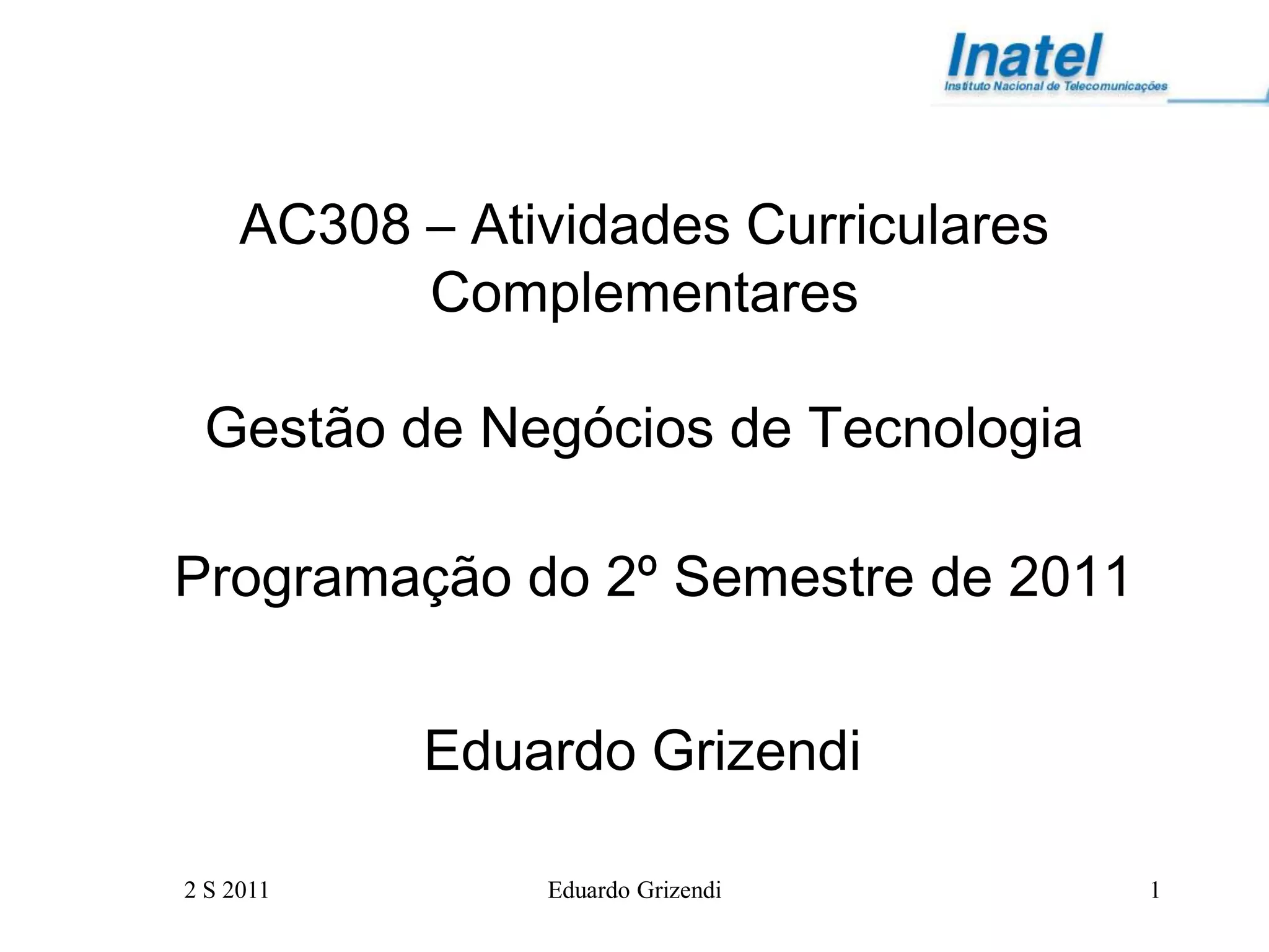 Este documento apresenta o programa de uma disciplina sobre Gestão de Negócios de Tecnologia. A disciplina introduz conceitos como negócios tecnológicos, ambientes de negócios em TIC e telecomunicações, gestão da inovação e financiamento de P&D. O programa inclui aulas sobre esses tópicos e sobre planejamento tecnológico estratégico e modelagem de negócios. A avaliação será um trabalho em grupo sobre planejamento tecnológico estratégico, incluindo avaliação