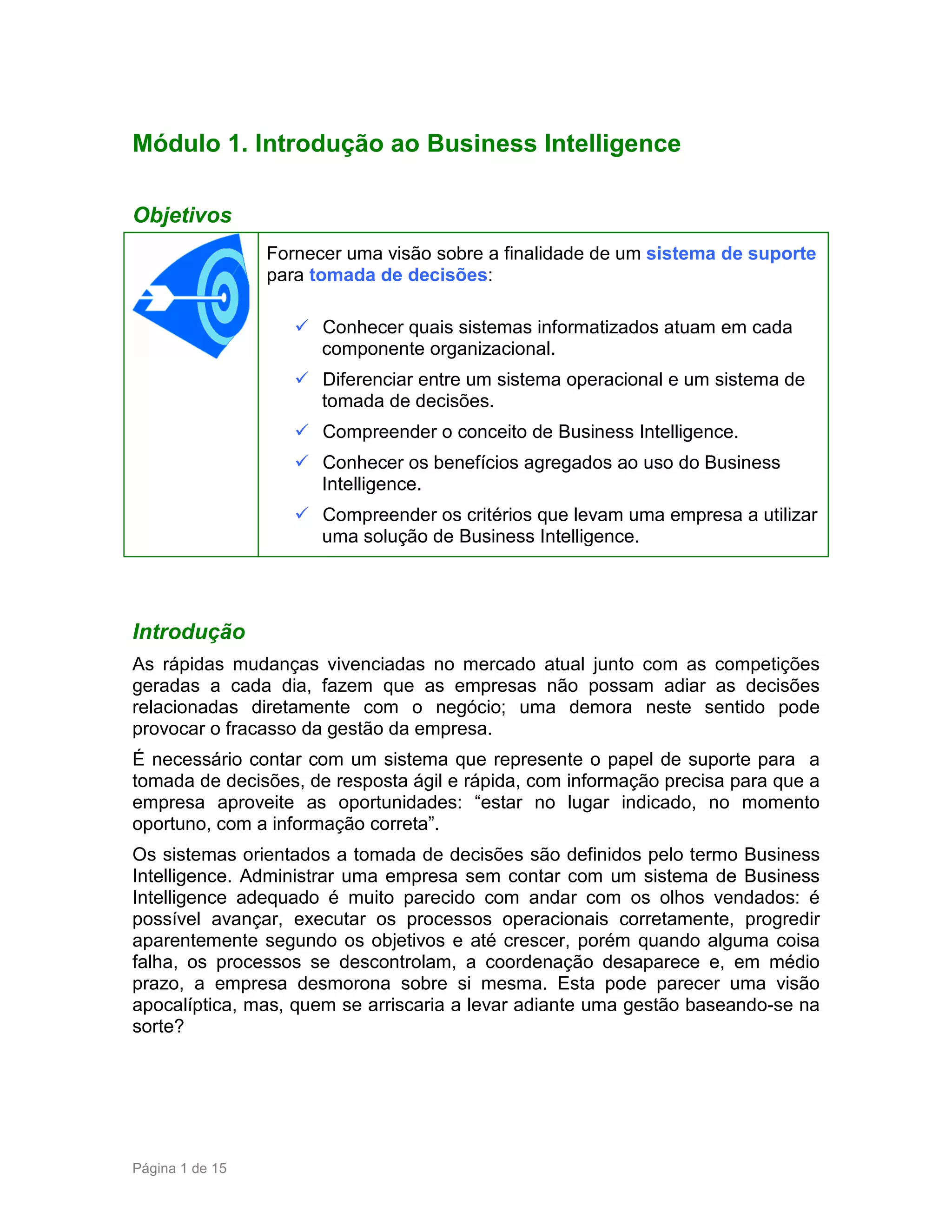 Este documento fornece uma introdução ao Business Intelligence (BI). Explica que o BI é um sistema de suporte para tomada de decisões que permite às empresas tomar decisões rápidas e precisas com base em informações confiáveis. Também discute como os sistemas OLTP diferem dos sistemas OLAP e Data Warehouses que são usados para BI, e quais tipos de empresas podem se beneficiar do uso de soluções de BI.