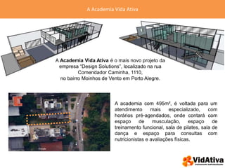 Este documento apresenta o plano de gerenciamento de aquisições para a Academia Vida Ativa, localizada em Porto Alegre. O plano descreve o escopo do projeto, a estrutura de divisão de tarefas, cronograma e critérios para contratação de fornecedores e execução da obra.