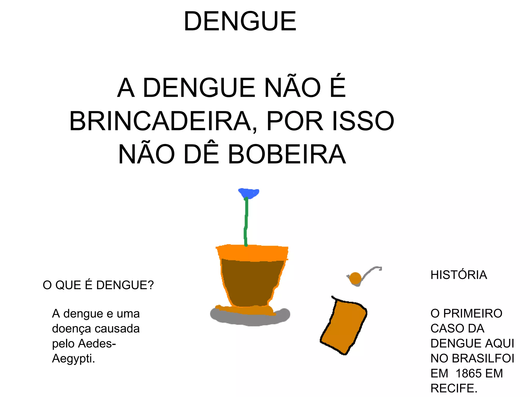 A dengue é uma doença causada pelo mosquito Aedes aegypti, que transmite quatro tipos de vírus. Os sintomas incluem febre alta, dor no corpo e hemorragia. Não deixar água parada é a melhor forma de prevenção, já que os mosquitos se reproduzem nesses locais. O primeiro caso de dengue no Brasil foi registrado em 1865 em Recife.