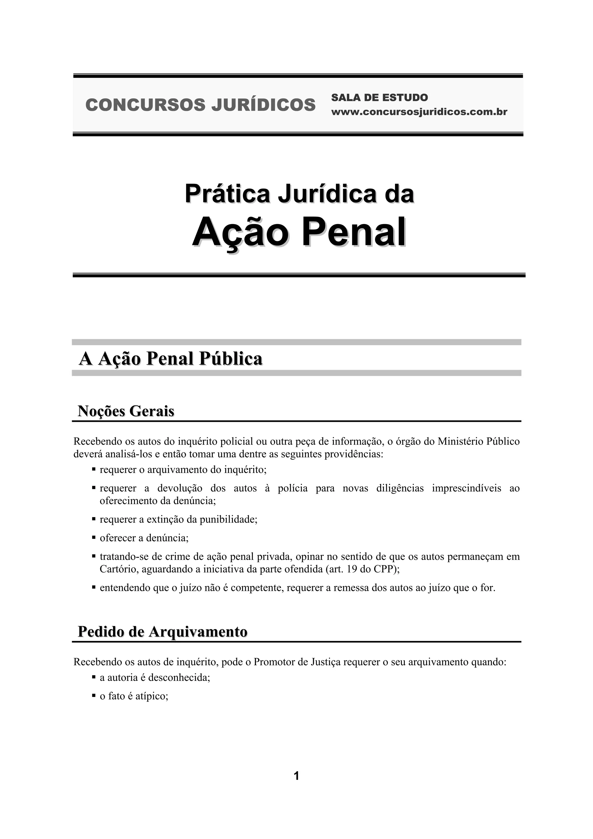 1. O documento descreve os procedimentos da ação penal pública e privada no Brasil, incluindo a análise de inquéritos policiais, pedidos de arquivamento, devolução para novas diligências, oferecimento de denúncia e requisitos para denúncias.