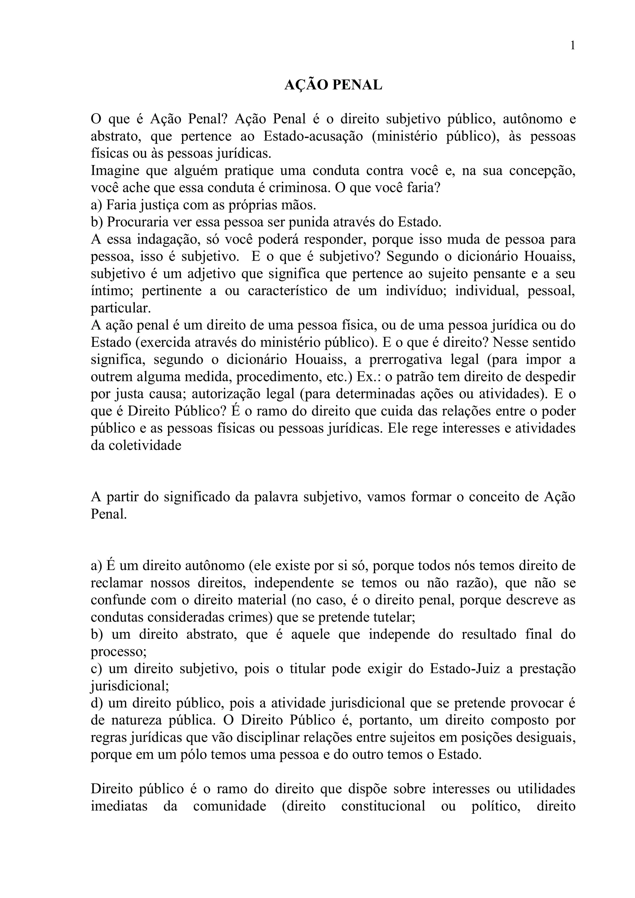 O documento define o que é ação penal como um direito subjetivo público que permite ao Estado, pessoas físicas ou jurídicas promoverem processos criminais. Disciplina a ação penal na Constituição Federal, no Código de Processo Penal e no Código Penal, distinguindo entre direito penal objetivo e subjetivo.