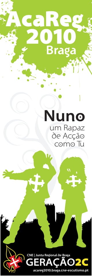 O documento descreve Nuno como uma pessoa de ação em diferentes fases da vida, desde menino até homem, enfatizando que ele sempre foi e continua sendo uma pessoa de ação, como o leitor. O texto é sobre um evento chamado AcaReg 2010 realizado na cidade de Braga e é patrocinado pela Junta Regional de Braga e pela GERAÇÃO2C.