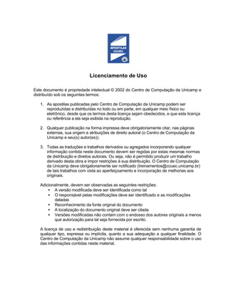 1. O documento descreve os termos de licenciamento para reprodução e distribuição de documentos do Centro de Computação da Unicamp.