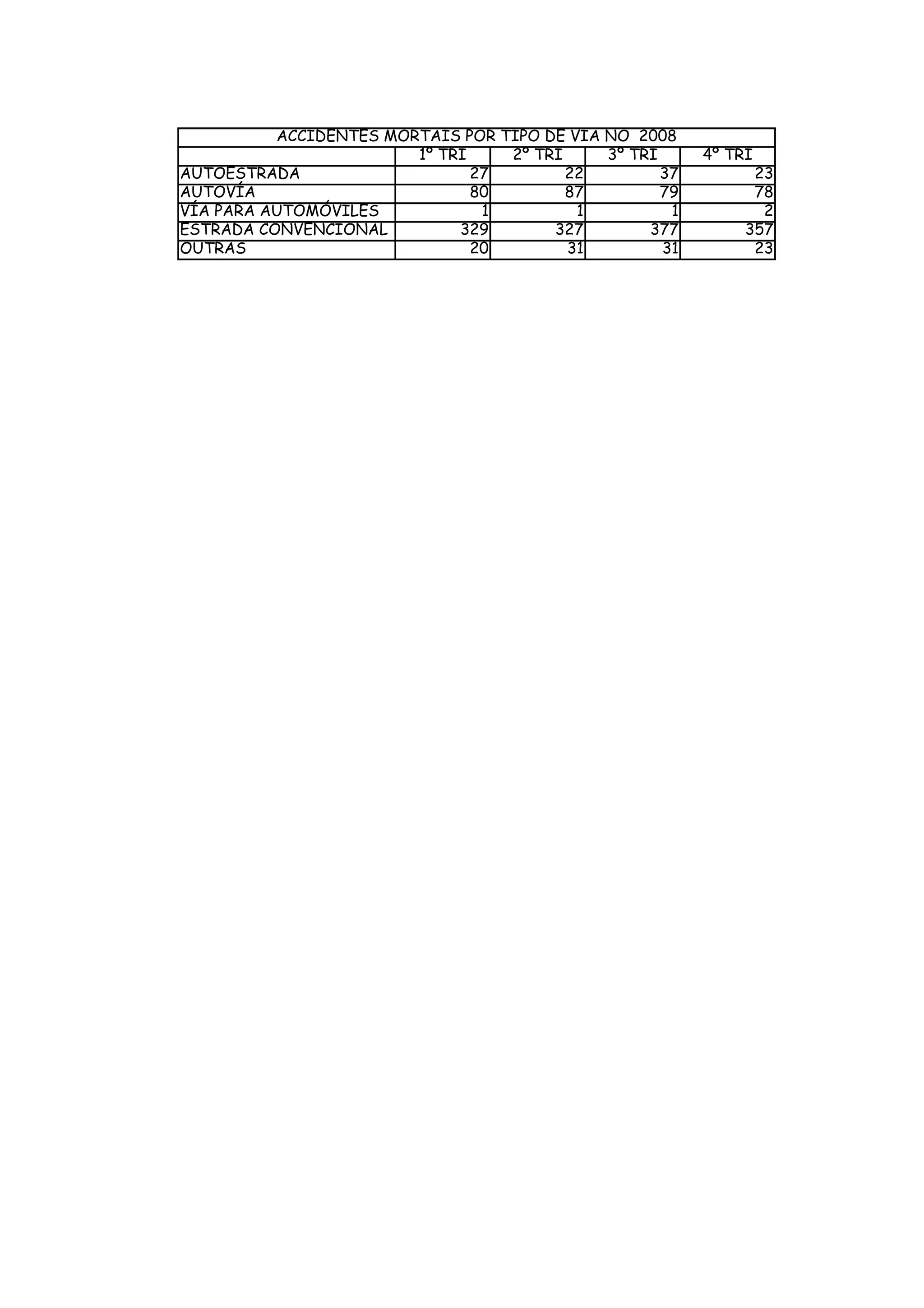 O documento fornece estatísticas sobre acidentes mortais por tipo de via em Portugal no ano de 2008. Mostra que as estradas convencionais tiveram o maior número de acidentes em todos os trimestres, seguidas por autoestradas e autovias. No total, houve 1933 acidentes mortais em 2008.