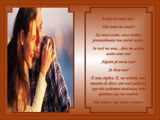 O texto discute a importância da flexibilidade e do compromisso em relacionamentos. Afirma que pedir para ser aceito "como é" sem estar disposto a se adaptar ao outro também é egoísta, e que relacionamentos requerem esforço de ambas as partes em se ajustarem, encontrando um equilíbrio. Defende que pequenos cedimentos feitos com amor podem garantir a felicidade conjunta e a longevidade da relação.
