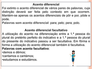O documento discute as modificações na acentuação após o Acordo Ortográfico, incluindo a extinção do acento diferencial em alguns pares de palavras, o uso facultativo do acento diferencial em verbos conjugados, e a dupla grafia permitida em certas palavras no Brasil e Portugal.