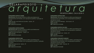 O documento detalha a atuação da empresa Quasar Manutenção Predial na execução de diversas obras de manutenção predial em edifícios plurihabitacionais em Santos, SP, entre 1995 e 1999. As atividades incluem hidrojateamento de fachadas, reposição de pastilhas e aplicações de rejunte, além de supervisão da mão de obra e cumprimento de normas técnicas. São listadas informações sobre cada projeto, como local, data e tipo de serviço realizado.