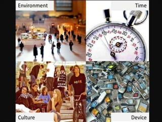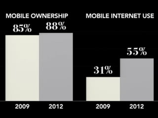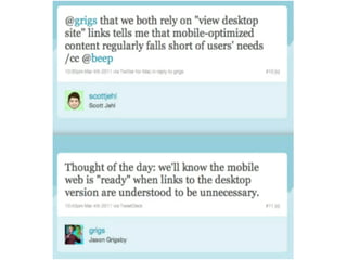 O documento discute a acessibilidade na web e no design mobile, destacando a importância de considerar as necessidades de diferentes usuários, incluindo pessoas com deficiências e condições diversas. A apresentação também aborda as estatísticas de acessibilidade no Brasil e enfatiza a necessidade de design inclusivo e priorização em ambientes mobile. Além disso, menciona que muitas soluções comuns em web design podem não ser acessíveis, sugerindo a abordagem de 'accessibility first' e 'mobile first' no desenvolvimento.