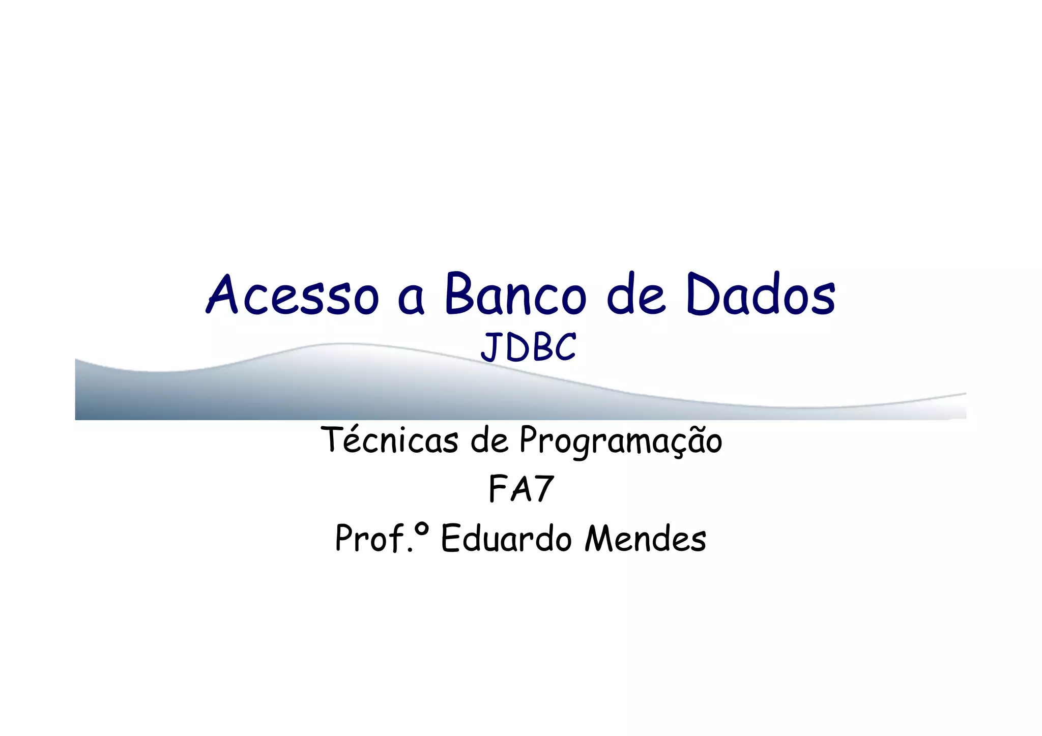 1) O documento discute técnicas de programação para acessar bancos de dados usando JDBC, incluindo como configurar o acesso ao banco de dados, executar consultas SQL, e lidar com resultados e erros.