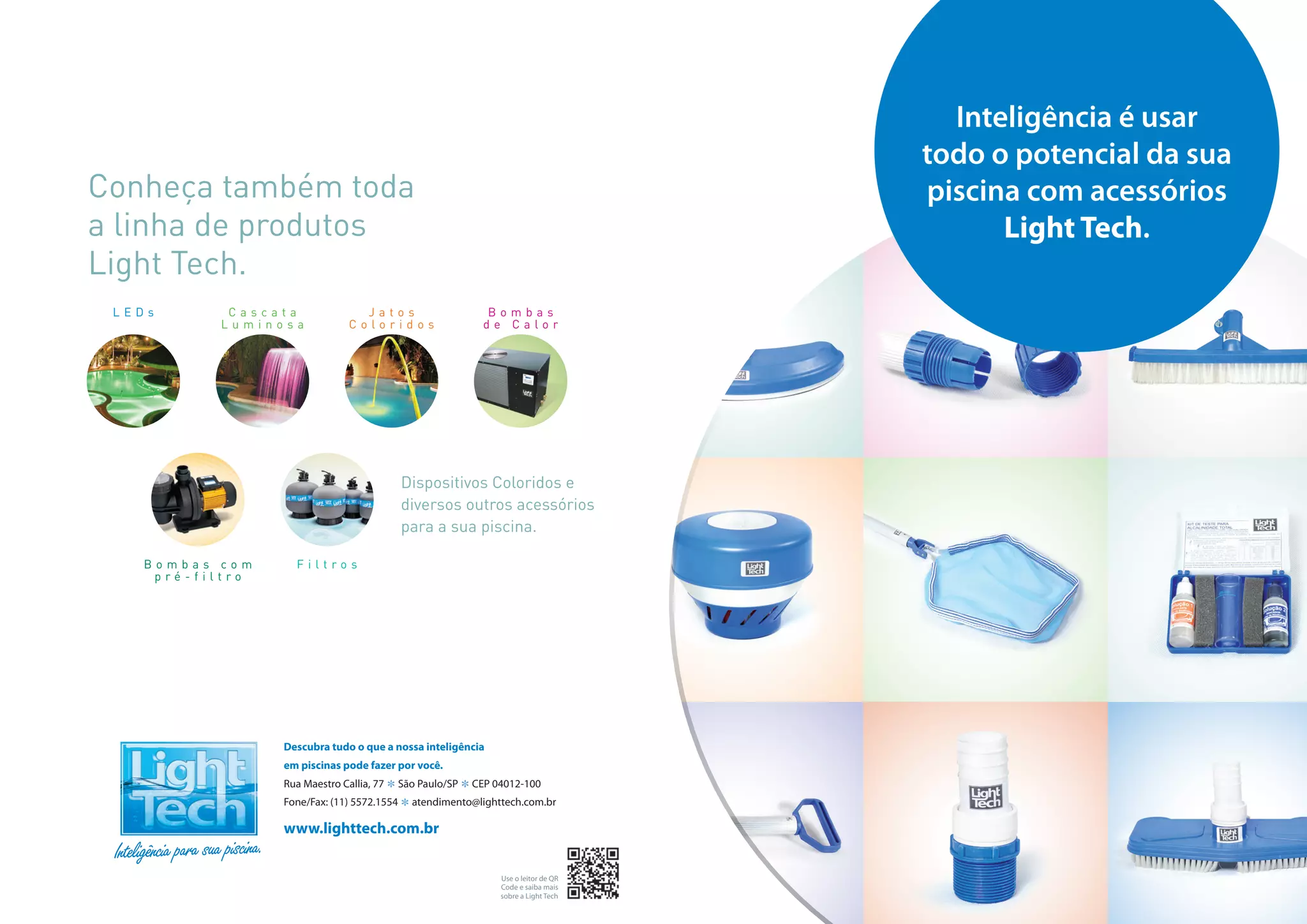 A Light Tech fornece uma variedade de acessórios inteligentes para piscinas, incluindo bombeamento, filtragem, iluminação e cloração, para melhorar a experiência na piscina e ampliar os momentos de lazer. A empresa oferece também testes de qualidade da água e uma linha completa de produtos.