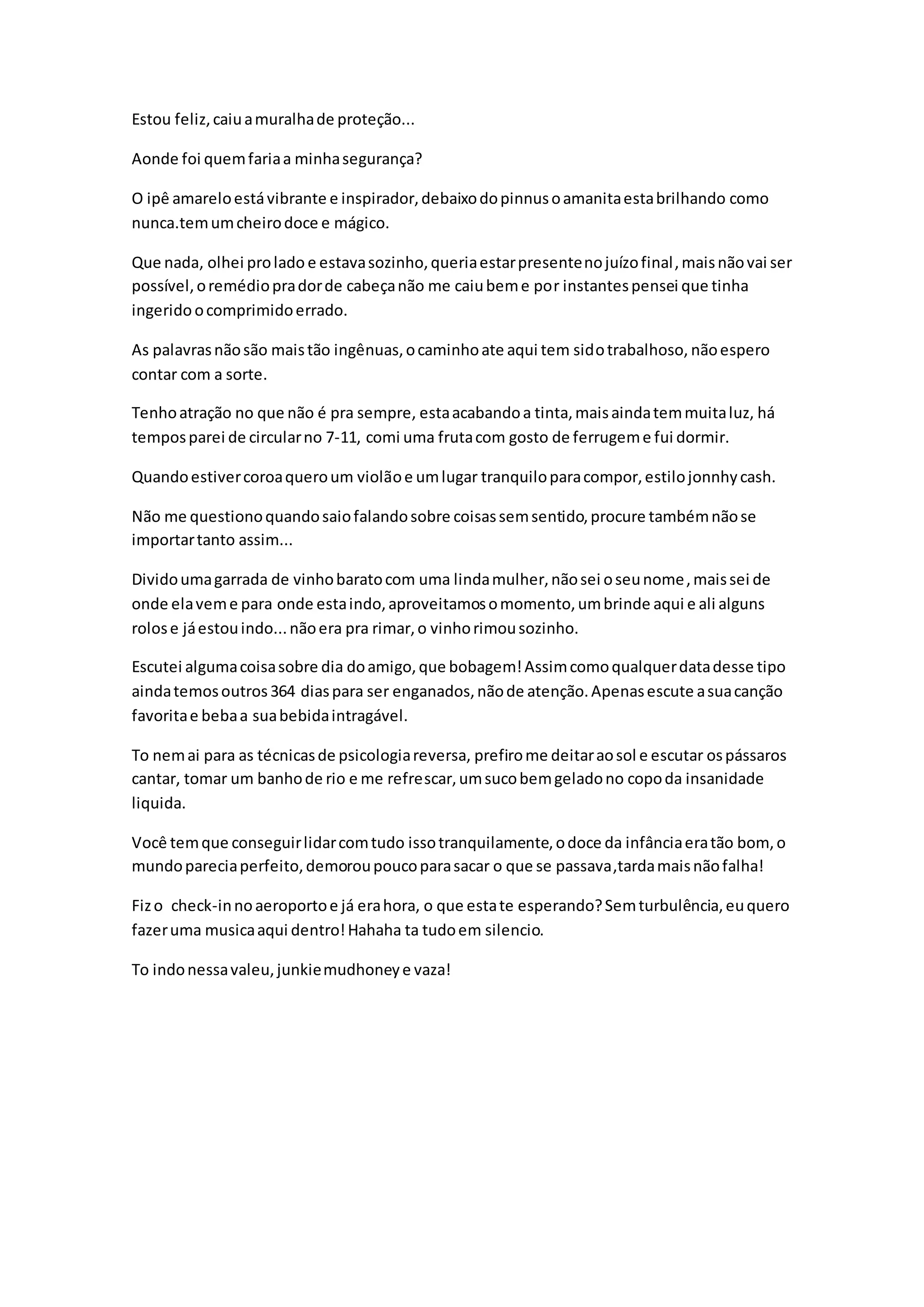 O autor expressa felicidade por ter derrubado uma barreira de proteção e observa a natureza ao redor. Ele reflete sobre o passado, quando era mais ingênuo, e sobre como o caminho até aqui foi difícil. O autor também fala sobre aproveitar momentos simples, como escutar música e beber algo refrescante.