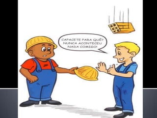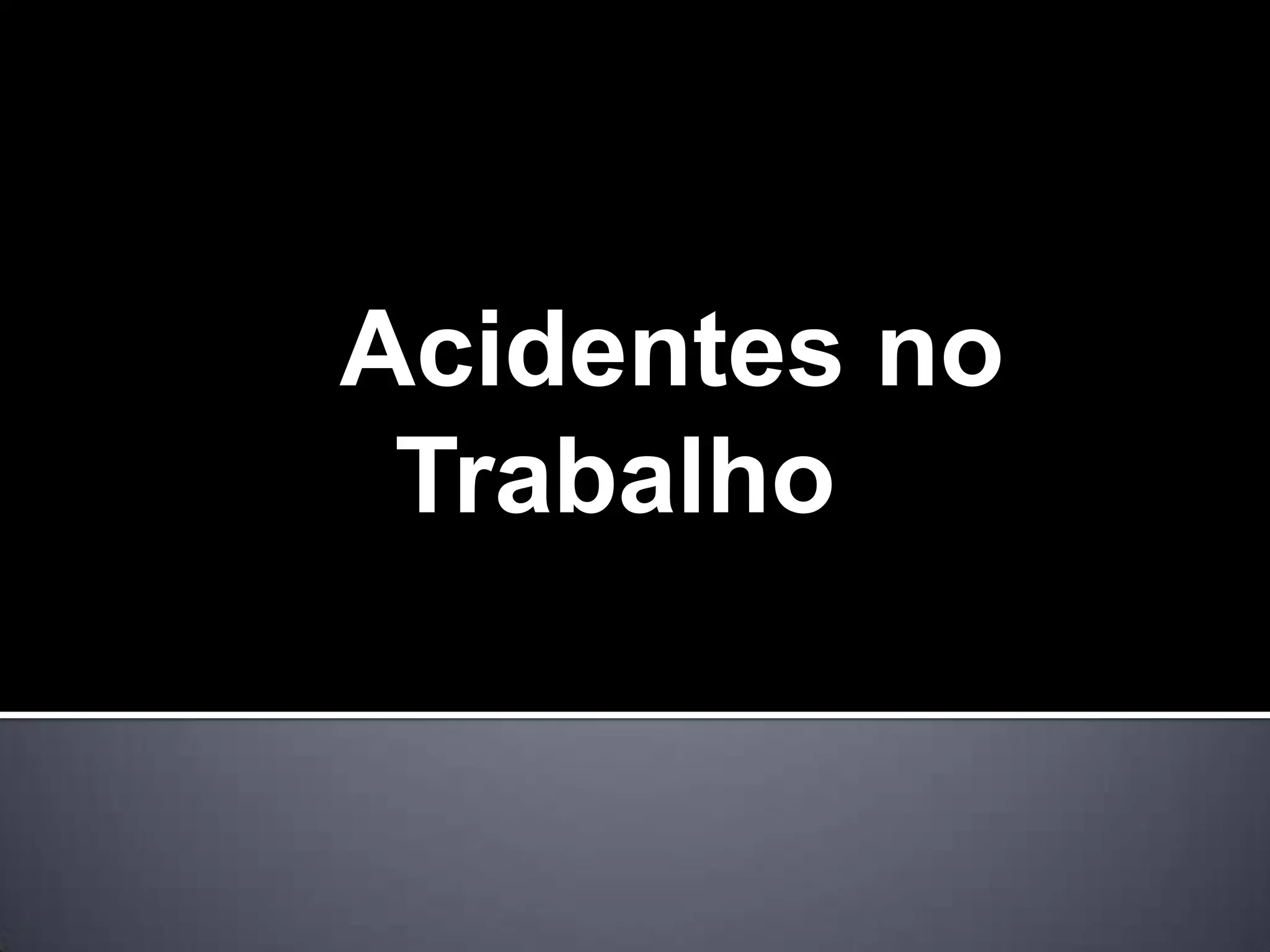 O documento discute acidentes no trabalho, definindo-os como aqueles que ocorrem no exercício da atividade laboral e causam lesões ou problemas de saúde. Detalha os direitos dos trabalhadores em caso de acidente, como licença médica, auxílio-doença e estabilidade no emprego. Também apresenta os principais fatores que causam acidentes e doenças ocupacionais.