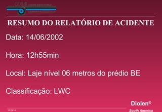 O documento descreve um acidente de trabalho ocorrido durante a montagem de uma tubulação, onde um empregado sofreu amputação do membro inferior direito e lesões graves no esquerdo ao utilizar uma lixadeira de forma incorreta e sem os equipamentos de proteção adequados. A investigação apontou que a vítima usava um disco incompatível com a máquina e havia removido a proteção da lixadeira.
