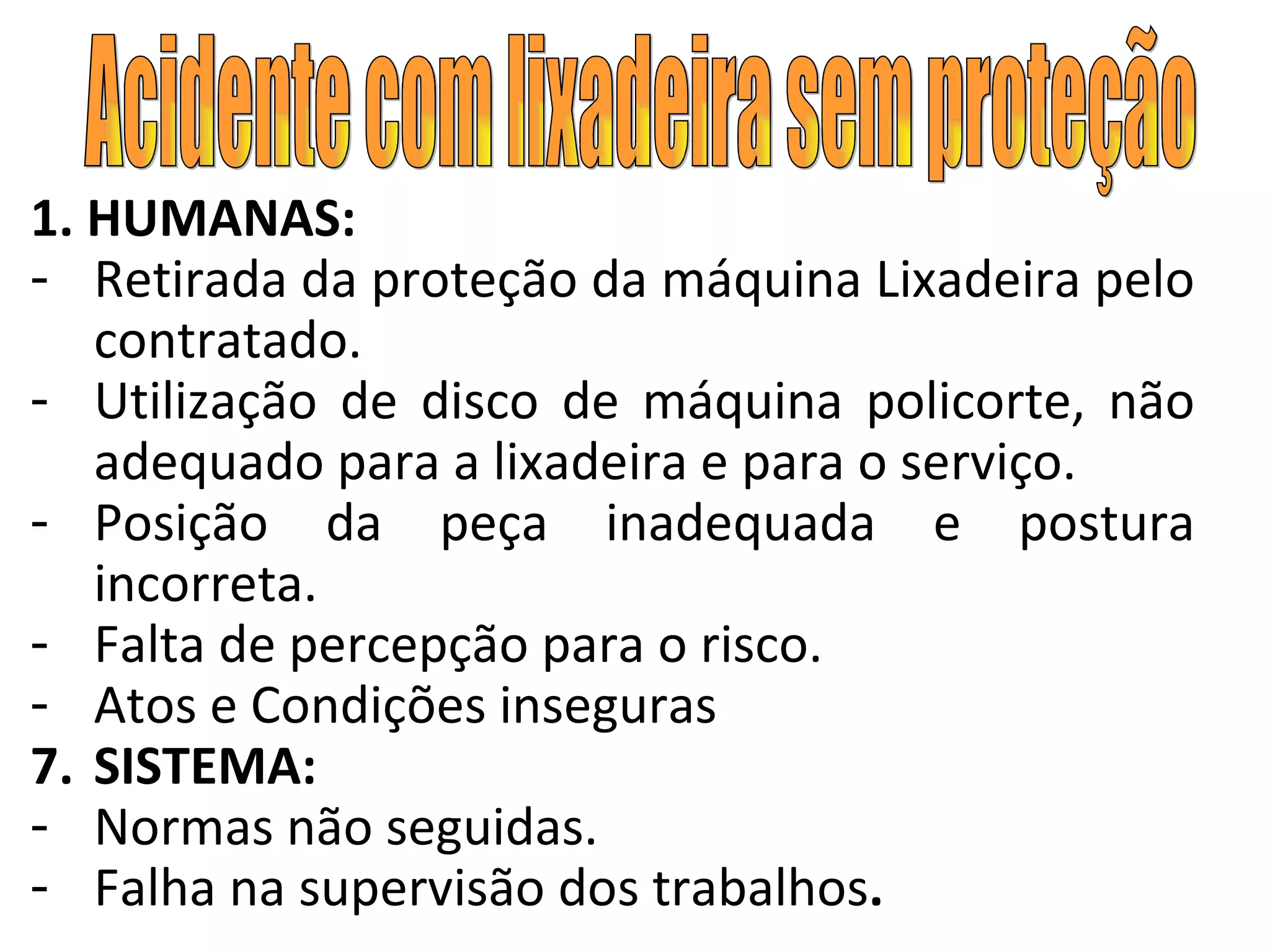 O trabalhador sofreu um grave acidente ao utilizar uma lixadeira sem proteção e com um disco inapropriado para o serviço. Ele posicionou a peça de forma inadequada e manuseou a máquina de forma insegura, resultando na amputação de uma perna e ferimentos graves na outra que quase causaram a morte do trabalhador. As normas de segurança não foram seguidas e houve falha na supervisão do trabalho.