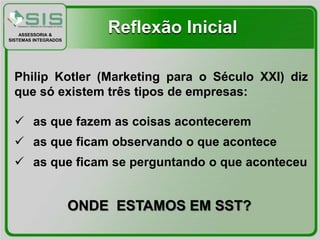 Este documento discute fatores internos e externos relacionados à segurança e saúde no trabalho, como a legislação, ações judiciais e doenças ocupacionais. Ele também aborda a importância da gestão da informação sobre saúde dos trabalhadores e dos custos relacionados à saúde e segurança no trabalho para as empresas.