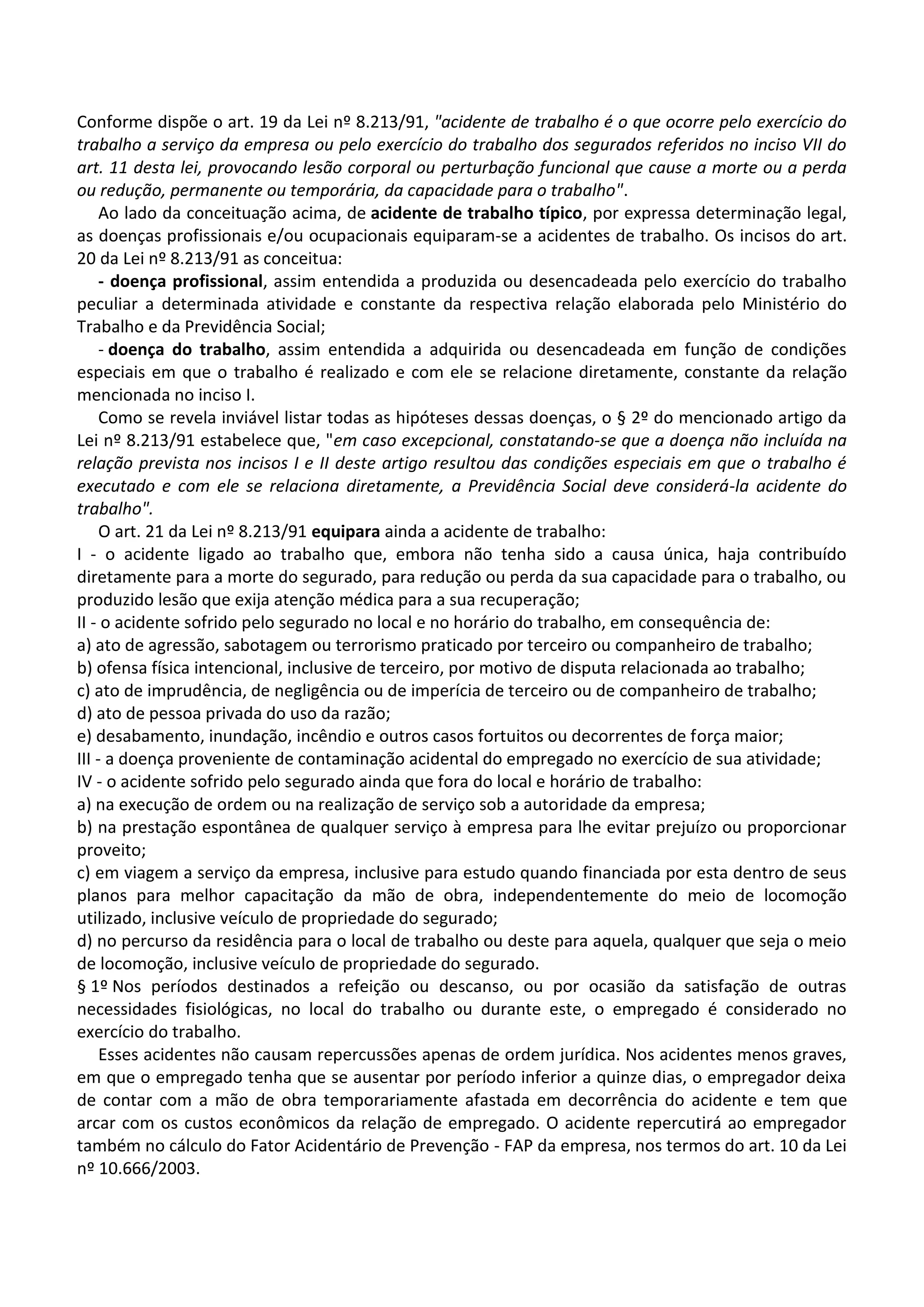 O documento define acidente de trabalho como qualquer lesão ou perturbação funcional causada pelo exercício do trabalho. Também equipara doenças profissionais e doenças do trabalho a acidentes de trabalho. Finalmente, lista várias situações que também são consideradas acidentes de trabalho segundo a lei, como acidentes fora do trabalho relacionados a serviço ou viagens a trabalho.