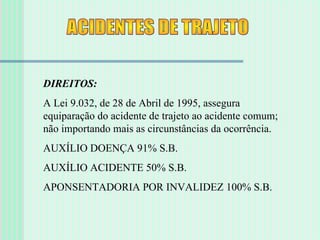 O documento define acidentes de trajeto como aqueles que ocorrem no caminho entre a casa e o trabalho, independente do meio de transporte. Ele detalha os direitos dos trabalhadores em caso de acidente de trajeto, como auxílio-doença e aposentadoria por invalidez. Também lista algumas das causas e consequências mais comuns de acidentes, além de dar dicas de segurança para motoristas, motociclistas e pedestres.