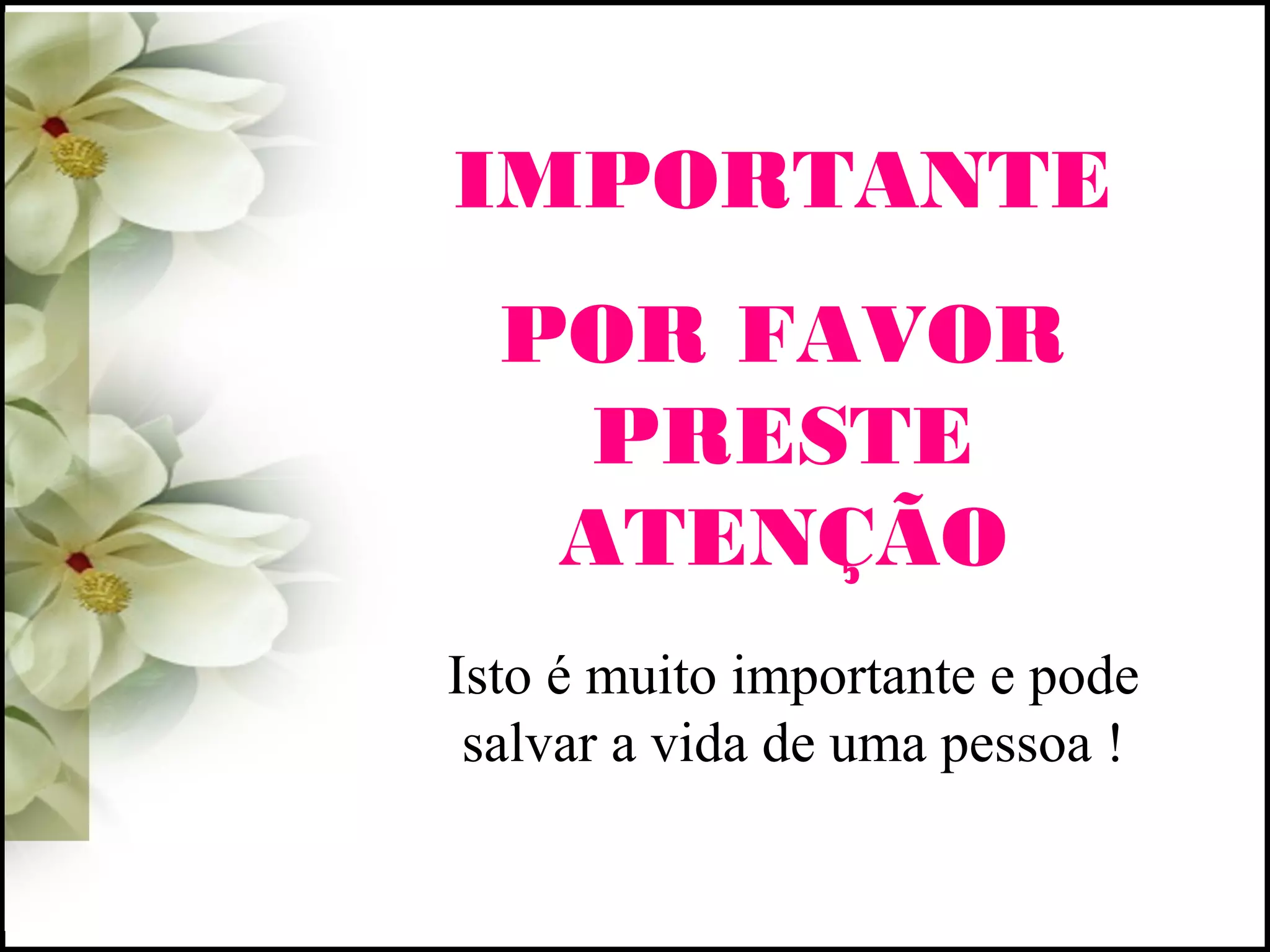 O documento descreve sintomas de um acidente vascular cerebral (AVC) e enfatiza a importância de reconhecê-los rapidamente através de três perguntas simples: pedir para a pessoa sorrir, levantar os braços e pronunciar uma frase. Se a pessoa tiver dificuldades em qualquer uma dessas tarefas, deve-se chamar emergência imediatamente, pois um AVC diagnosticado e tratado nas primeiras três horas pode ter seus efeitos totalmente revertidos.