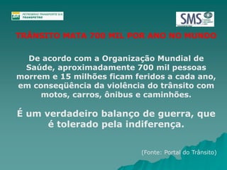 O documento discute acidentes de trânsito no mundo e no Brasil. Aproximadamente 700 mil pessoas morrem e 15 milhões ficam feridas em acidentes de trânsito no mundo a cada ano. No Brasil, 60 mil pessoas morrem em acidentes de trânsito a cada ano. O documento também fornece estatísticas sobre acidentes fatais na Petrobras em 2003.