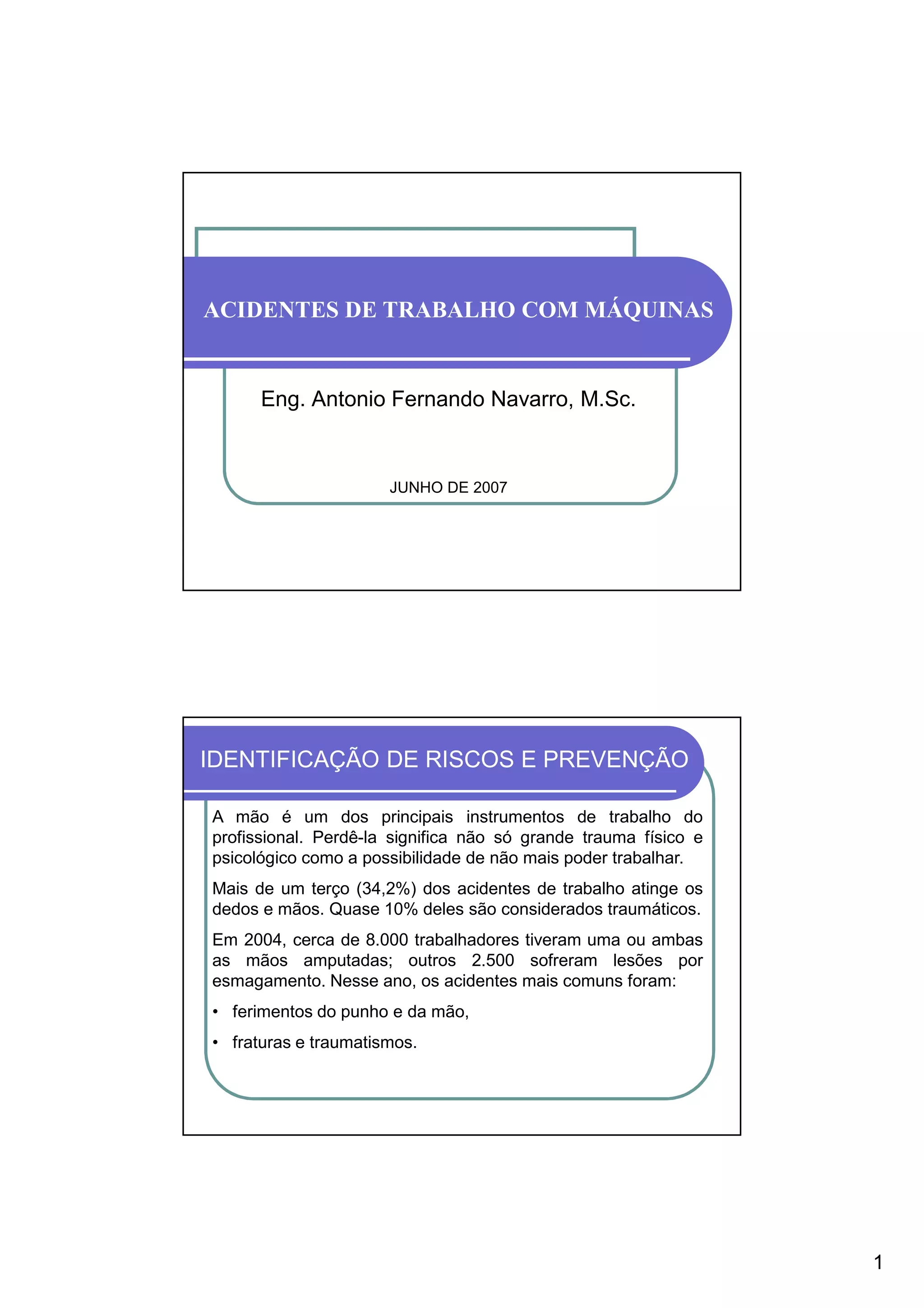 O documento discute acidentes de trabalho com máquinas, identificando riscos e medidas preventivas. Mais de um terço dos acidentes atingem as mãos e dedos, com amputações e lesões. As principais causas incluem distração, desconhecimento de riscos e falhas de proteção. O documento fornece recomendações para prevenir acidentes, como desligar máquinas durante manutenção, usar equipamentos de proteção individual e sinalizar áreas de perigo.