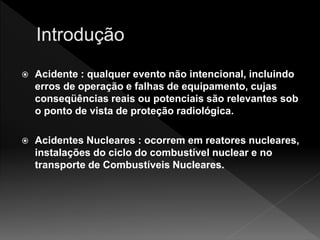 O documento descreve três grandes acidentes nucleares: o acidente da usina nuclear de Three Mile Island nos EUA em 1979, o acidente na usina nuclear de Fukushima no Japão em 2011 após um terremoto e tsunami, e o desastre de Chernobyl na Ucrânia em 1986. Detalha os eventos que levaram a cada acidente e seus impactos, como evacuações e vítimas.