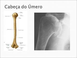 O documento descreve as principais características anatômicas da superfície dos ossos, incluindo eminências, depressões e forames. As eminências incluem cabeças, côndilos e processos que formam articulações ou servem para inserções musculares. As depressões, como fossas e sulcos, acomodam nervos, vasos ou permitem articulações. Os forames permitem a passagem de estruturas através dos ossos.