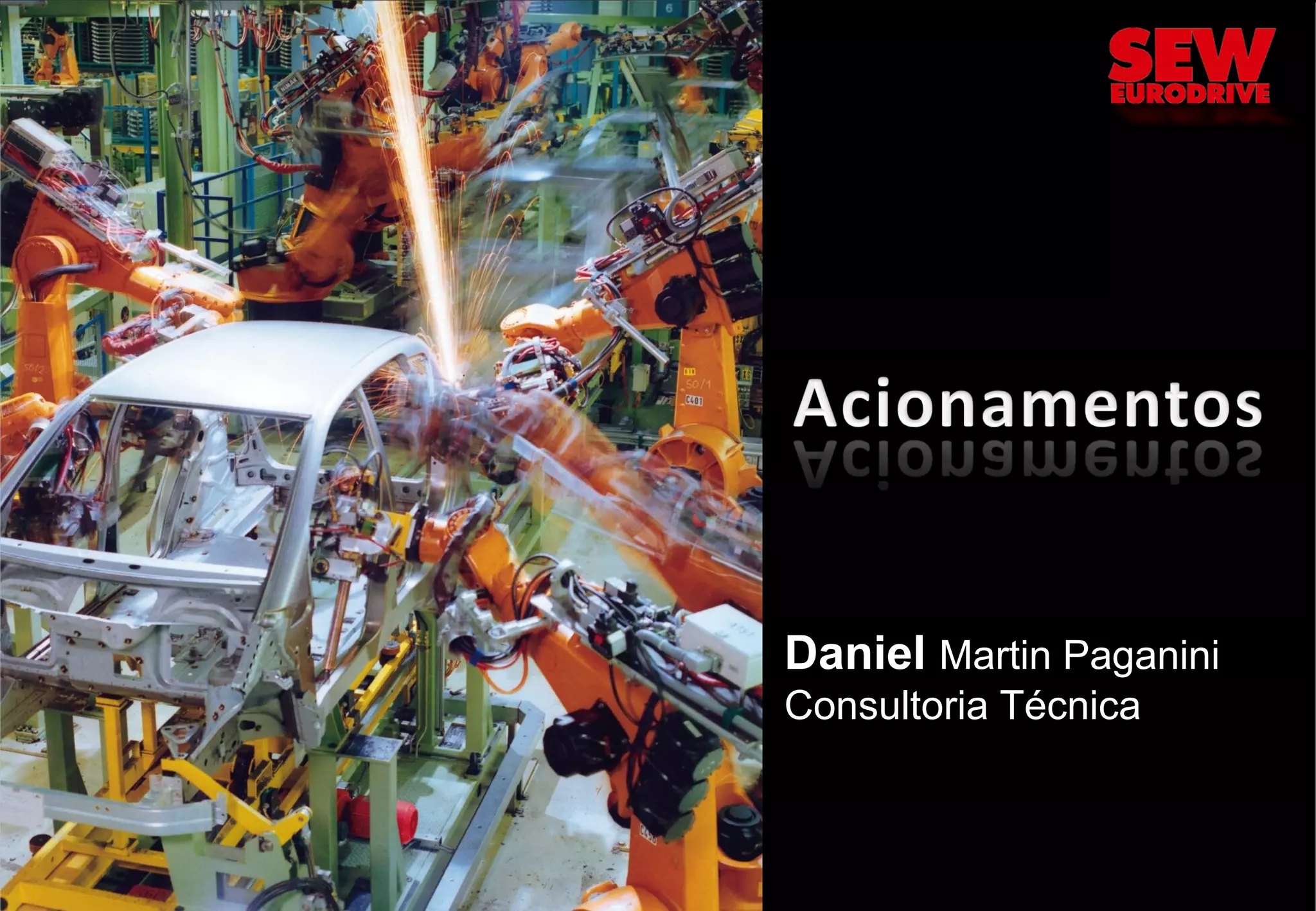 O documento apresenta a história e a evolução da empresa SEW-EURODRIVE, especializada em acionamentos e motores elétricos. Inclui informações sobre produtos, serviços e aplicações em automação industrial, além de dados sobre a presença global da empresa, com destaque para suas operações no Brasil. São discutidos também aspectos técnicos dos motores e suas aplicações em processos industriais, com ênfase na eficiência energética.