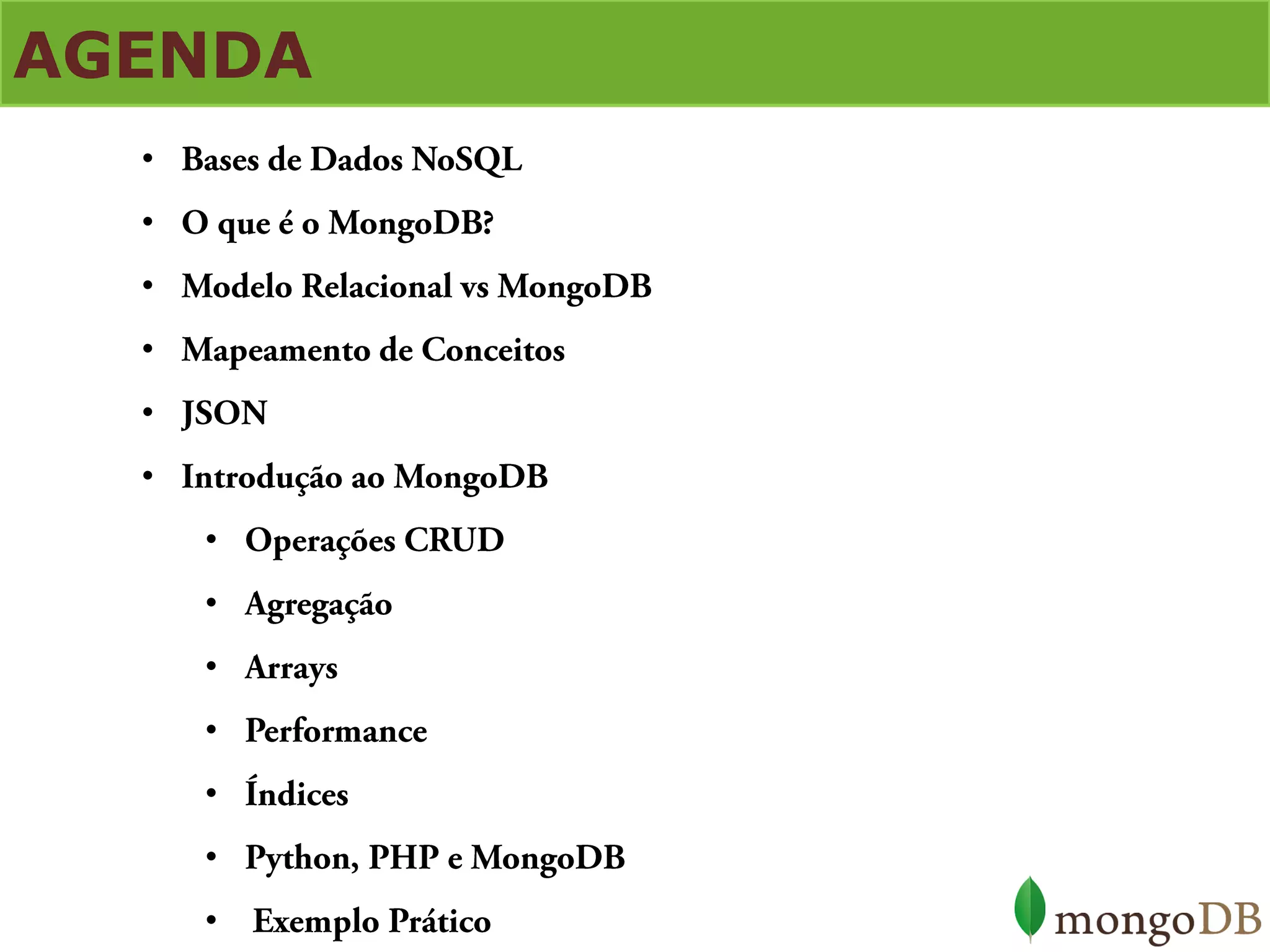 O documento discute as principais funcionalidades e conceitos do MongoDB, incluindo sua arquitetura não-relacional baseada em documentos JSON, operações básicas como insert, find, update e remove, além de exemplos demonstrando o mapeamento entre conceitos relacionais e não-relacionais.