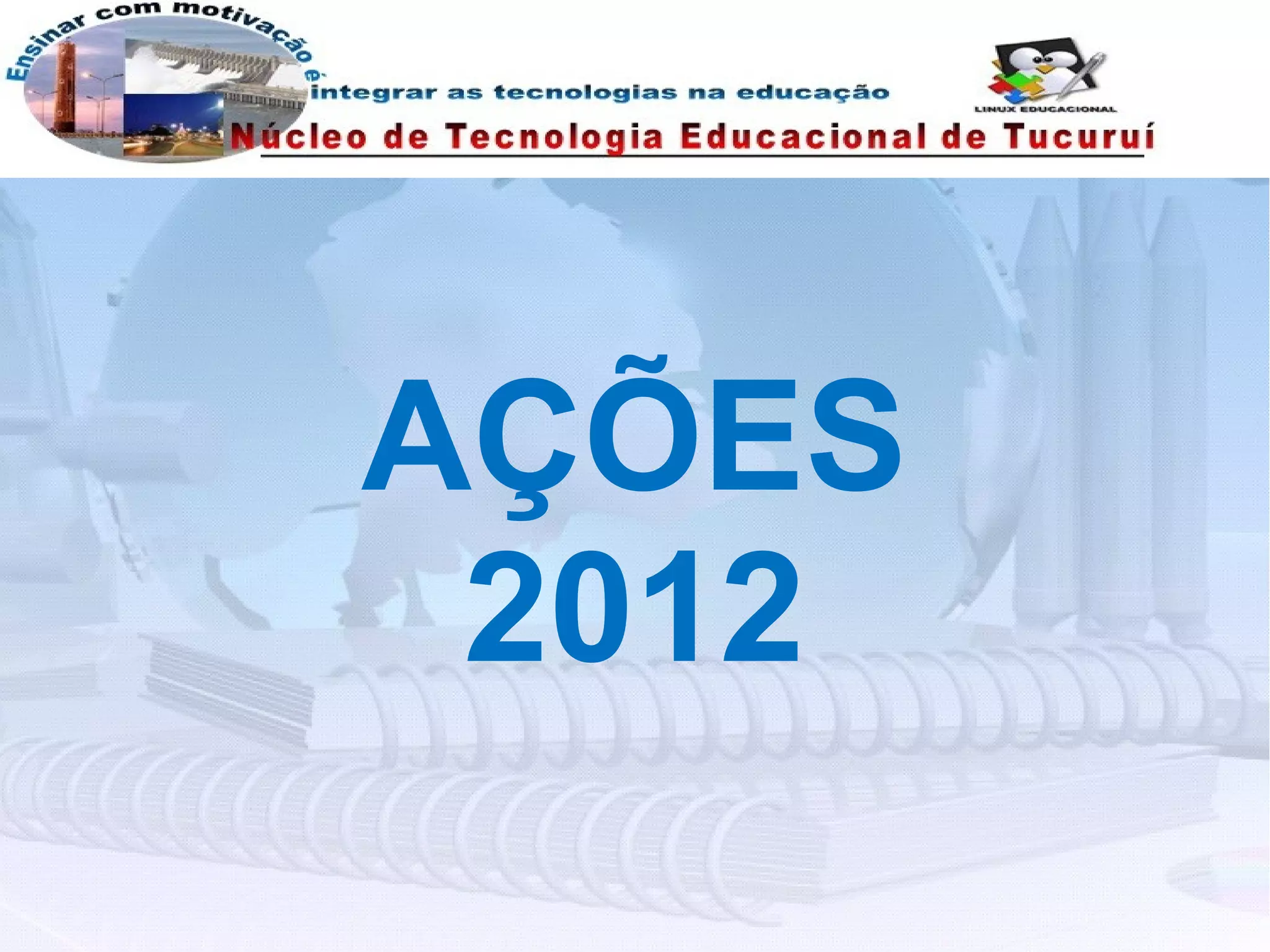 O documento lista as ações realizadas em 2012 pela equipe NTE-Tucuruí, incluindo cursos sobre educação digital, projetos, oficinas de ferramentas digitais e reuniões pedagógicas em escolas de Breu Branco, Goianésia, Novo Repartimento e Tucuruí.