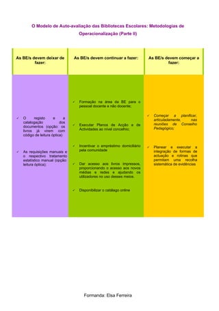 As bibliotecas escolares devem parar de registrar e catalogar documentos manualmente e fazer requisições manuais, e em vez disso devem começar a planificar articuladamente com os conselhos pedagógicos e integrar novas formas de coletar evidências sistematicamente. Elas devem continuar a fornecer formação, executar planos de ação, incentivar empréstimos da comunidade e disponibilizar o acervo online.
