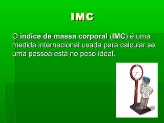 O documento discute o índice de massa corporal (IMC), que é uma medida internacional usada para calcular se uma pessoa está no peso ideal, e fornece a fórmula de cálculo do IMC e uma tabela de resultados.