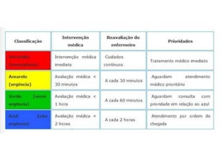 O documento descreve as diretrizes de acolhimento e classificação de risco para atendimento em serviços de saúde. O acolhimento envolve escutar o usuário e reconhecer seu protagonismo no processo de saúde. A classificação de risco organiza a "fila de espera" para priorizar aqueles com maior necessidade de atendimento urgente de acordo com quatro grupos de prioridade. Nenhum paciente pode ser dispensado sem primeiro receber acolhimento e encaminhamento.