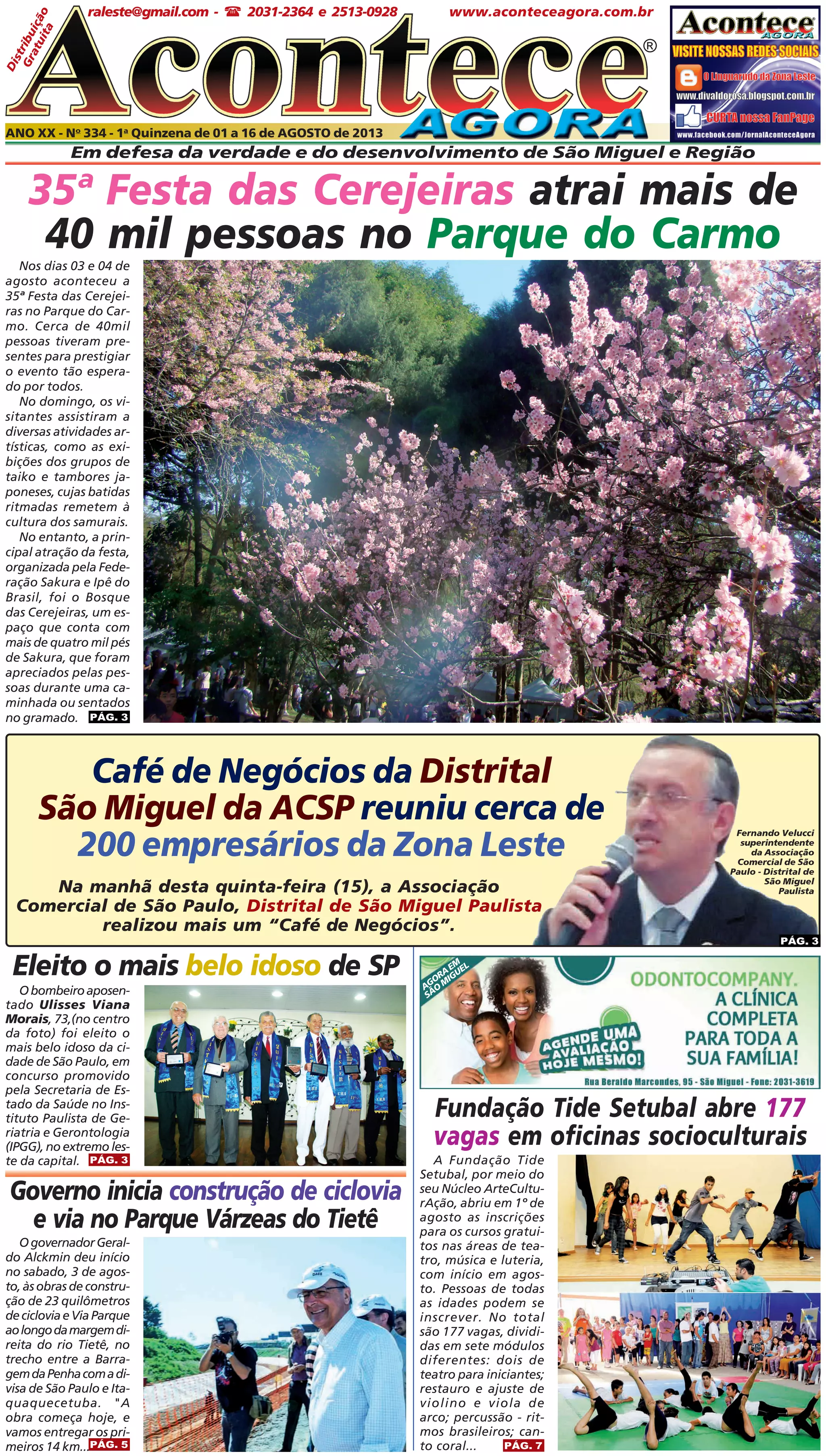 A 35a Festa das Cerejeiras no Parque do Carmo atraiu cerca de 40 mil pessoas nos dias 3 e 4 de agosto. O evento contou com apresentações artísticas como grupos de taiko e tambores japoneses, além do Bosque das Cerejeiras, com mais de 4 mil cerejeiras apreciadas pelos visitantes. A festa, organizada pela Federação Sakura e Ipê do Brasil, celebrou a cultura japonesa por meio de shows, trajes e rituais típicos.