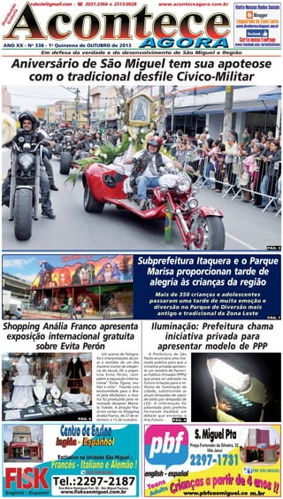 O documento descreve eventos realizados na cidade de São Miguel Paulista, incluindo uma festa para crianças no Parque Marisa, o aniversário da cidade com desfile cívico-militar, e uma exposição gratuita sobre Evita Perón em shopping local.