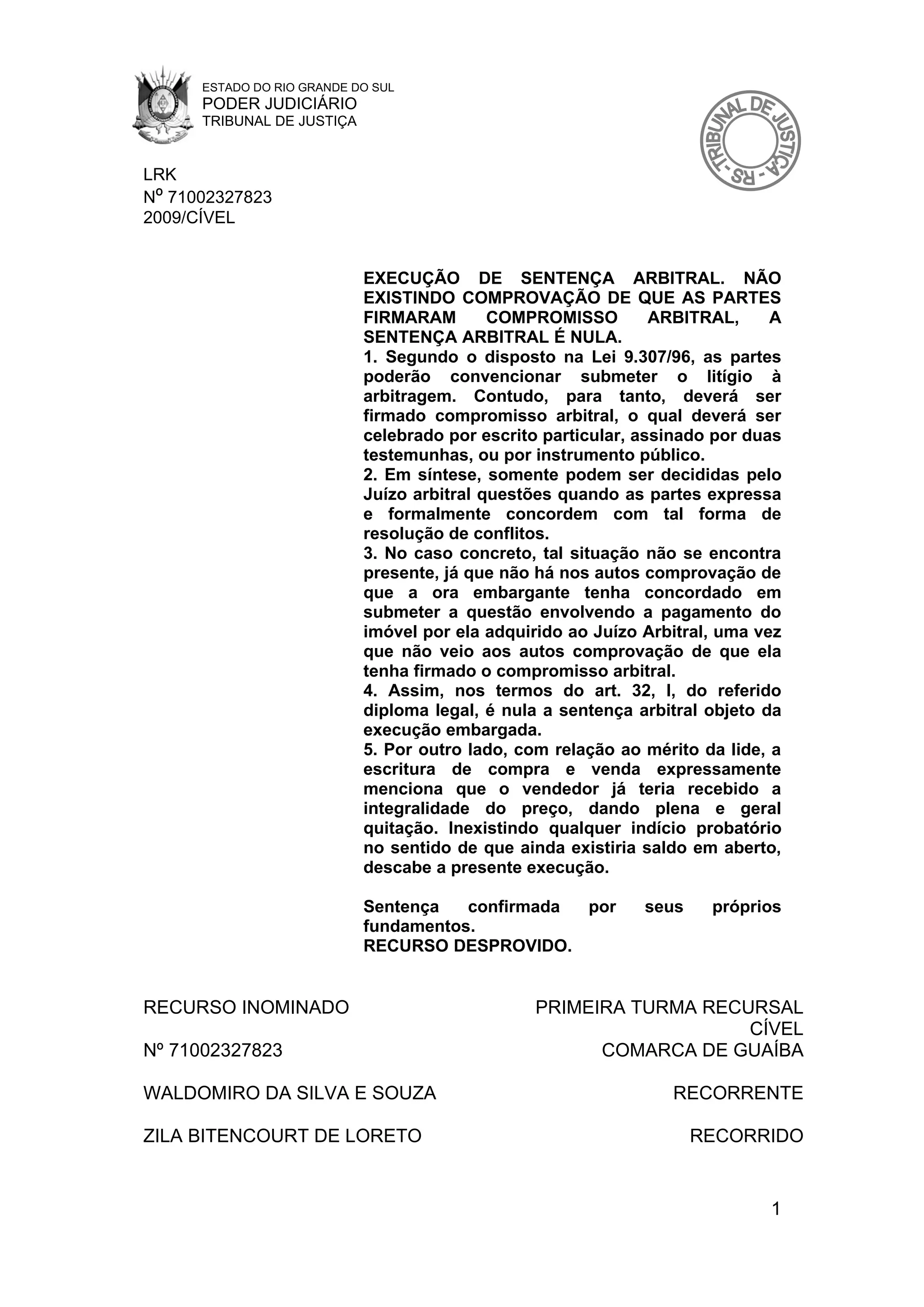 Este documento trata de um recurso inominado sobre uma execução de sentença arbitral. A sentença arbitral foi considerada nula porque não havia comprovação de que as partes tinham firmado um compromisso arbitral. Além disso, a escritura de compra e venda já mencionava que o vendedor havia recebido o preço integral, não havendo indícios de saldo em aberto. Assim, o recurso foi negado e a sentença de primeiro grau foi mantida.