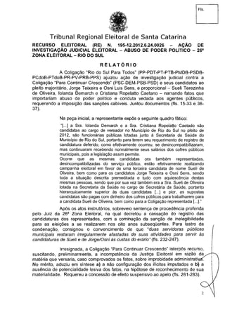 Este documento trata de um recurso eleitoral movido por uma coligação e candidatos após condenação por abuso de poder político. A sentença condenou as partes à cassação do registro e inelegibilidade por supostamente terem concedido licenças remuneradas fictícias a servidoras para atuarem como cabos eleitorais em campanha. Os recorrentes alegam não ter havido abuso de poder e os fatos não terem potencial lesivo. O relator nega preliminares e prefaciais e analisará o mérito.