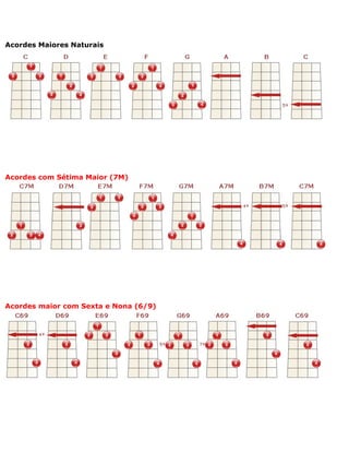 Este documento fornece um dicionário básico de 168 acordes para cavaquinho, incluindo acordes maiores, menores, com sétimas e nonas. Explica como montar os acordes usando a tabela de intervalos e as notas no braço do instrumento. O autor sugere decorar os acordes para tocar sem usar o dicionário.
