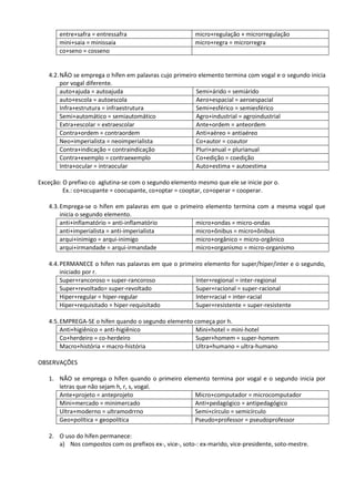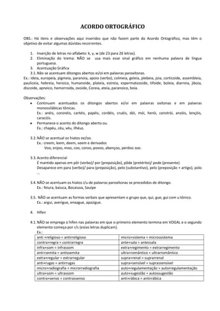O documento resume as principais alterações ortográficas introduzidas pelo Acordo Ortográfico, incluindo: 1) Adição de letras ao alfabeto e remoção do trema; 2) Novas regras de acentuação para ditongos, hiatos e formas verbais; 3) Uso restrito do hífen em palavras compostas.