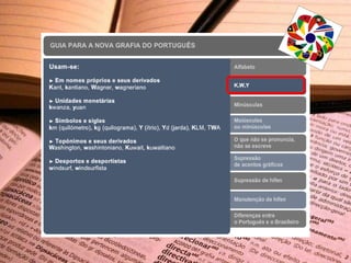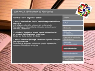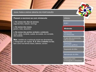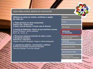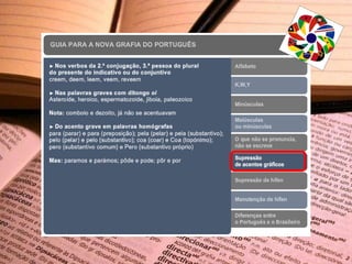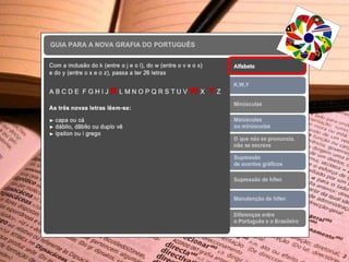 O novo Acordo Ortográfico entrou em vigor em janeiro de 2009, mas até 2012 haveria um período de transição durante o qual a antiga ortografia ainda poderia ser utilizada. O documento lista as principais alterações da língua portuguesa de acordo com o novo acordo ortográfico.