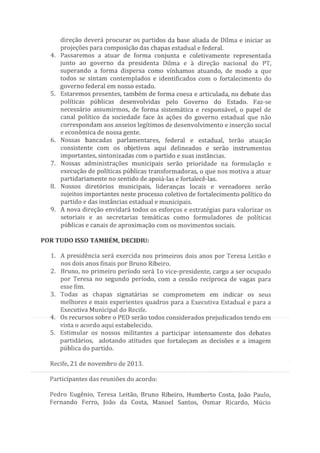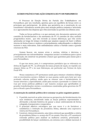 Íntegra do acordo interno do PT lançado nesta sexta-feira (22), que prega a unidade da sigla em Pernambuco.