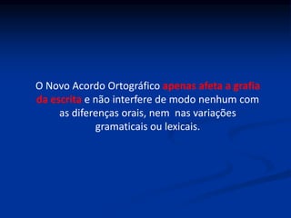 O documento descreve as principais alterações introduzidas pelo Novo Acordo Ortográfico da Língua Portuguesa de 1990, incluindo a adição das letras K, W e Y ao alfabeto, a remoção de consoantes mudas em certas sequências e a simplificação das regras de acentuação e hífen.