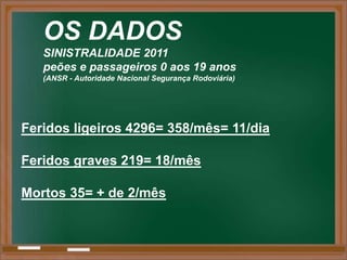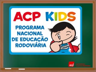 Este documento descreve um programa de educação rodoviária para crianças dos 4 aos 7 anos em Portugal. Apresenta estatísticas sobre acidentes envolvendo crianças nesta faixa etária e detalha os objetivos, público-alvo, parceiros, materiais educativos e ações do programa, como kits para alunos e professores com livros, jogos e cartazes sobre segurança no trânsito.