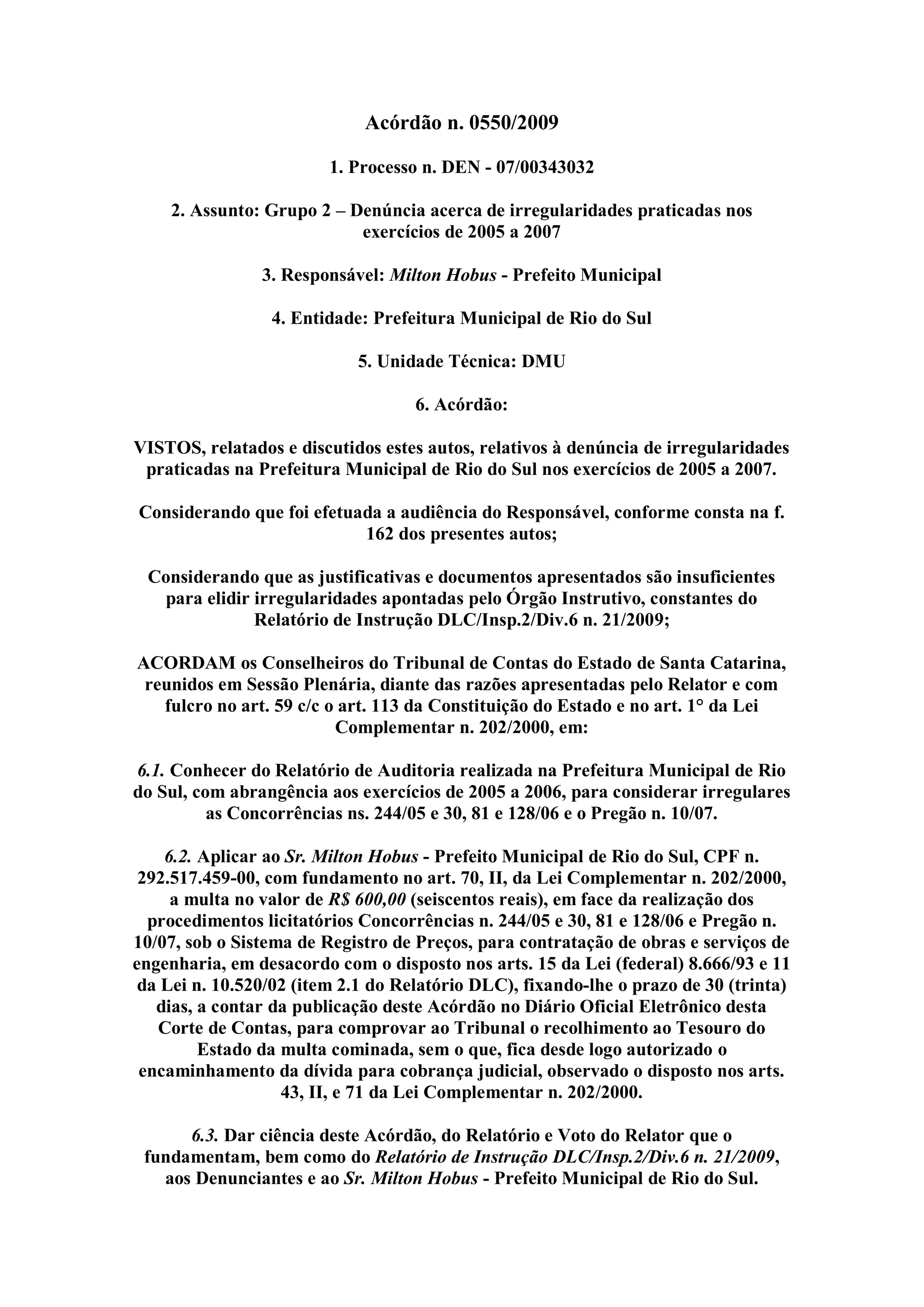 O Tribunal de Contas do Estado de Santa Catarina julgou irregularidades nas licitações realizadas pela Prefeitura Municipal de Rio do Sul entre 2005 e 2007 e aplicou uma multa de R$600 ao prefeito Milton Hobus. O Tribunal considerou as justificativas do prefeito insuficientes e determinou o pagamento da multa em 30 dias.