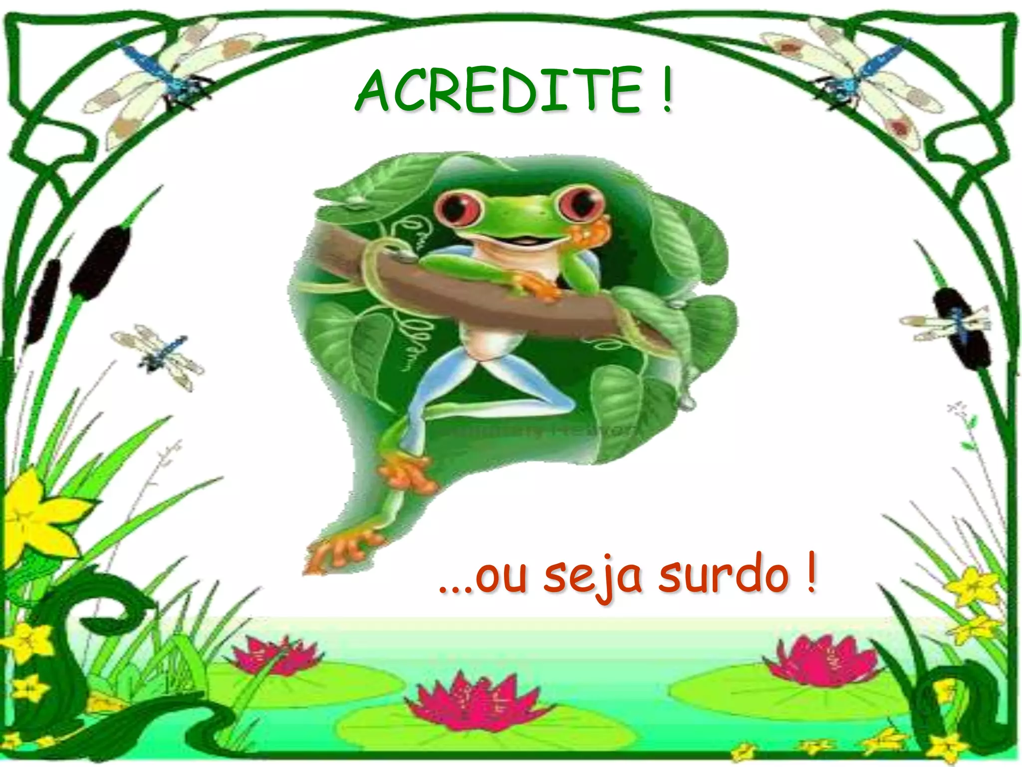 A história conta de uma corrida de sapinhos para alcançar o topo de uma torre. A maioria da multidão torcia contra os sapinhos, dizendo que eles não conseguiriam, fazendo com que a maioria desistisse. No final, só um sapinho continuou, que se descobriu ser surdo e não ouvia as críticas, conseguindo alcançar o topo. A mensagem é para não deixar críticas negativas derrubarem nossos sonhos e acreditar em nós mesmos.