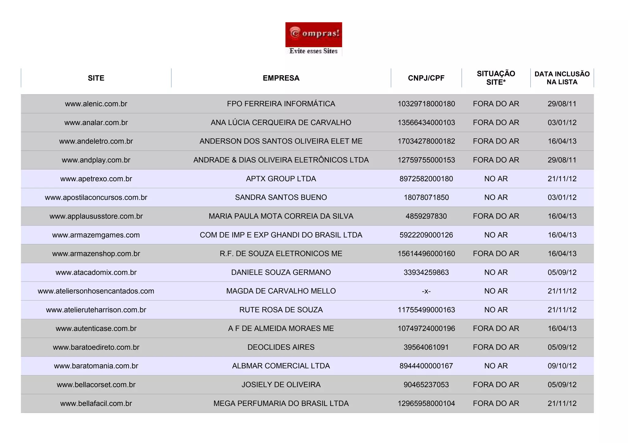 Sites retirados da lista pois os responsáveis entraram em contato, atualizaram os dados cadastrais e solucionaram as reclamações dos consumidores: www.shop13.com.br,