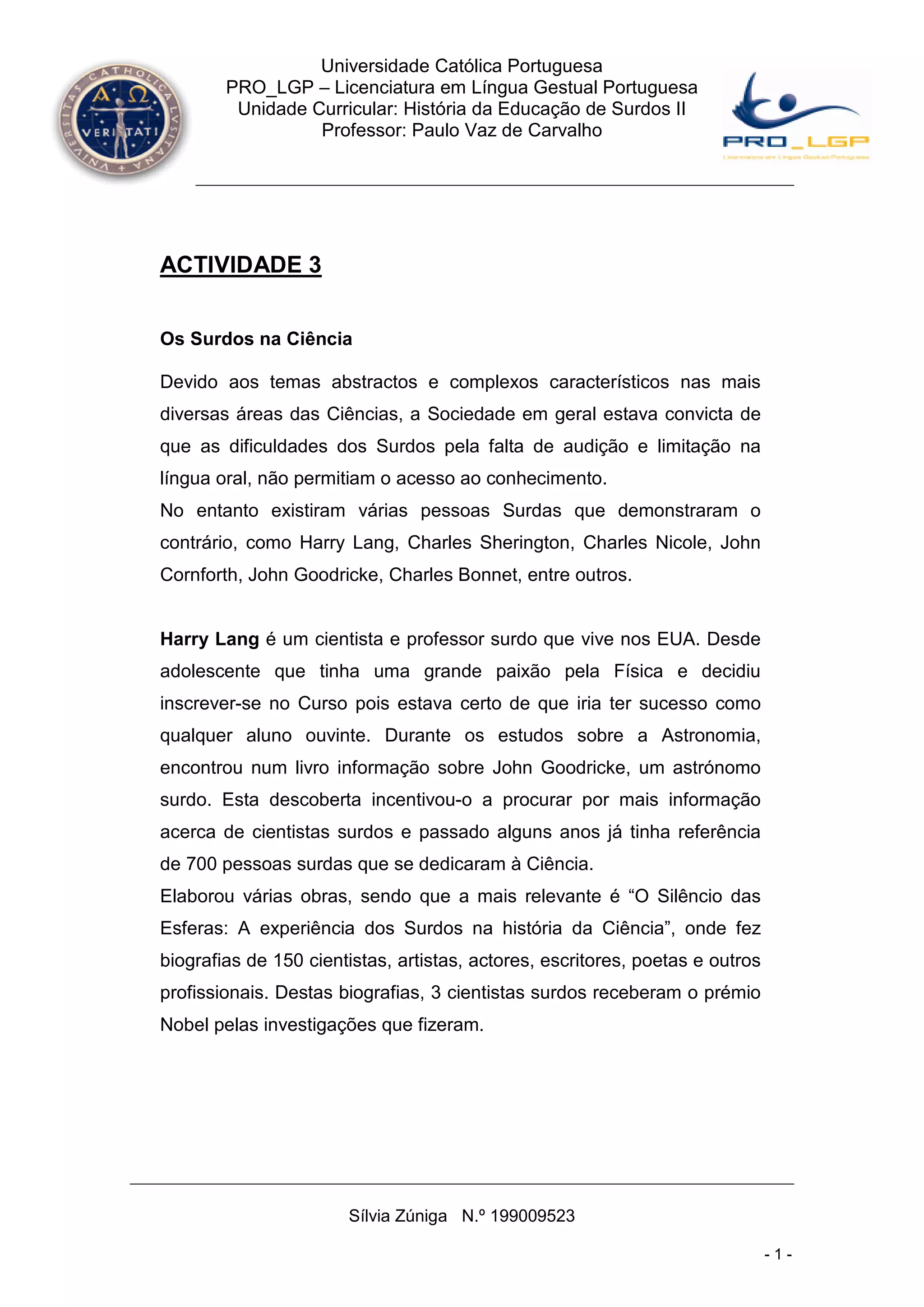 O documento discute vários cientistas, artistas e profissionais surdos que fizeram contribuições significativas em suas áreas, desafiando as percepções de que a surdez impediria o sucesso acadêmico. Detalha exemplos como Harry Lang, que compilou biografias de 700 cientistas surdos, e três cientistas surdos que receberam Prêmios Nobel.