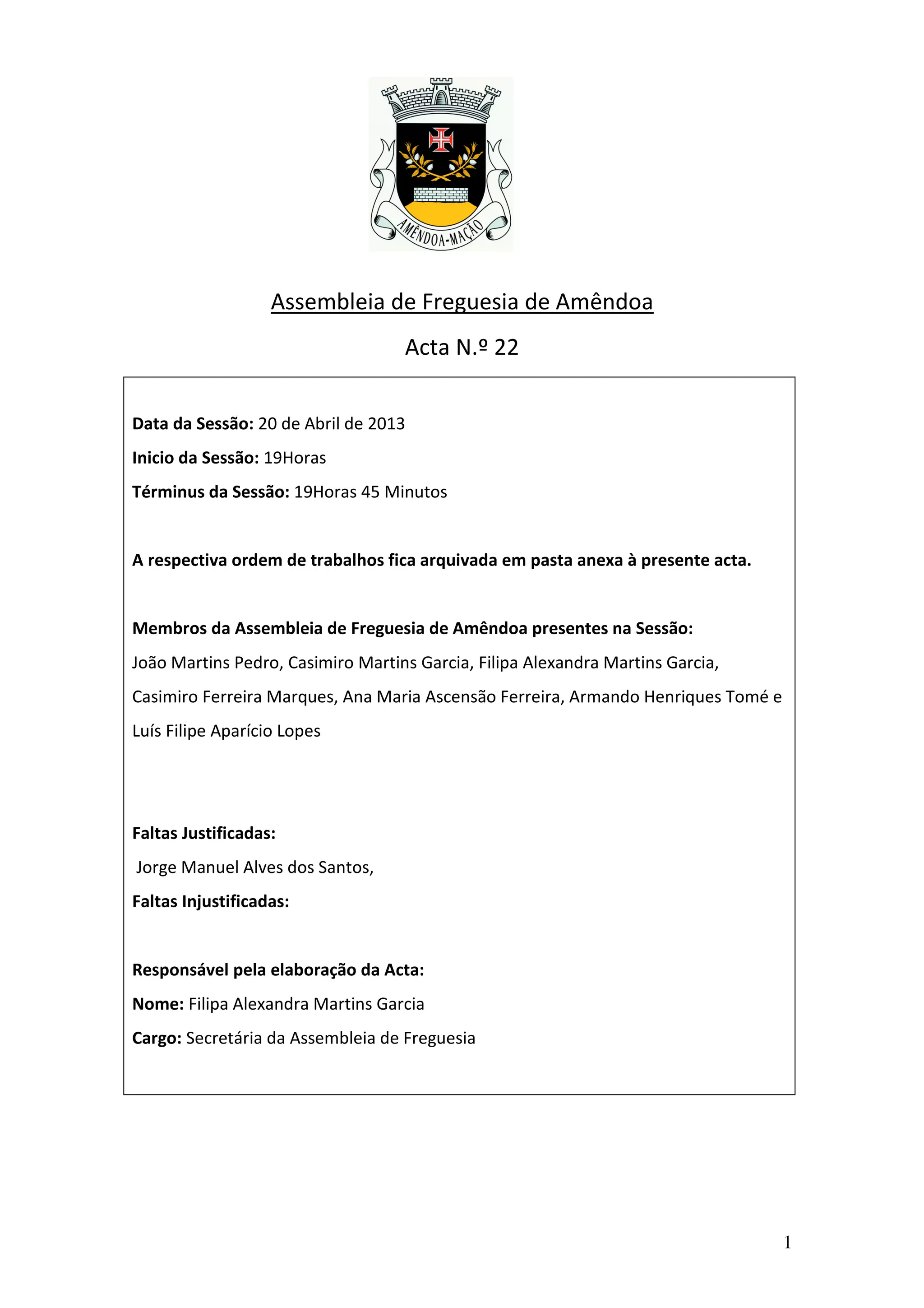 A ata resume a reunião da Assembleia de Freguesia de Amêndoa realizada em 20 de Abril de 2013. Os principais pontos discutidos foram: (1) a aprovação da ata da reunião anterior; (2) a apresentação das disponibilidades financeiras da Junta de Freguesia; (3) a aprovação das contas da gerência de 2012 com algumas abstenções; (4) a aprovação da primeira revisão orçamental de 2013 também com abstenções.