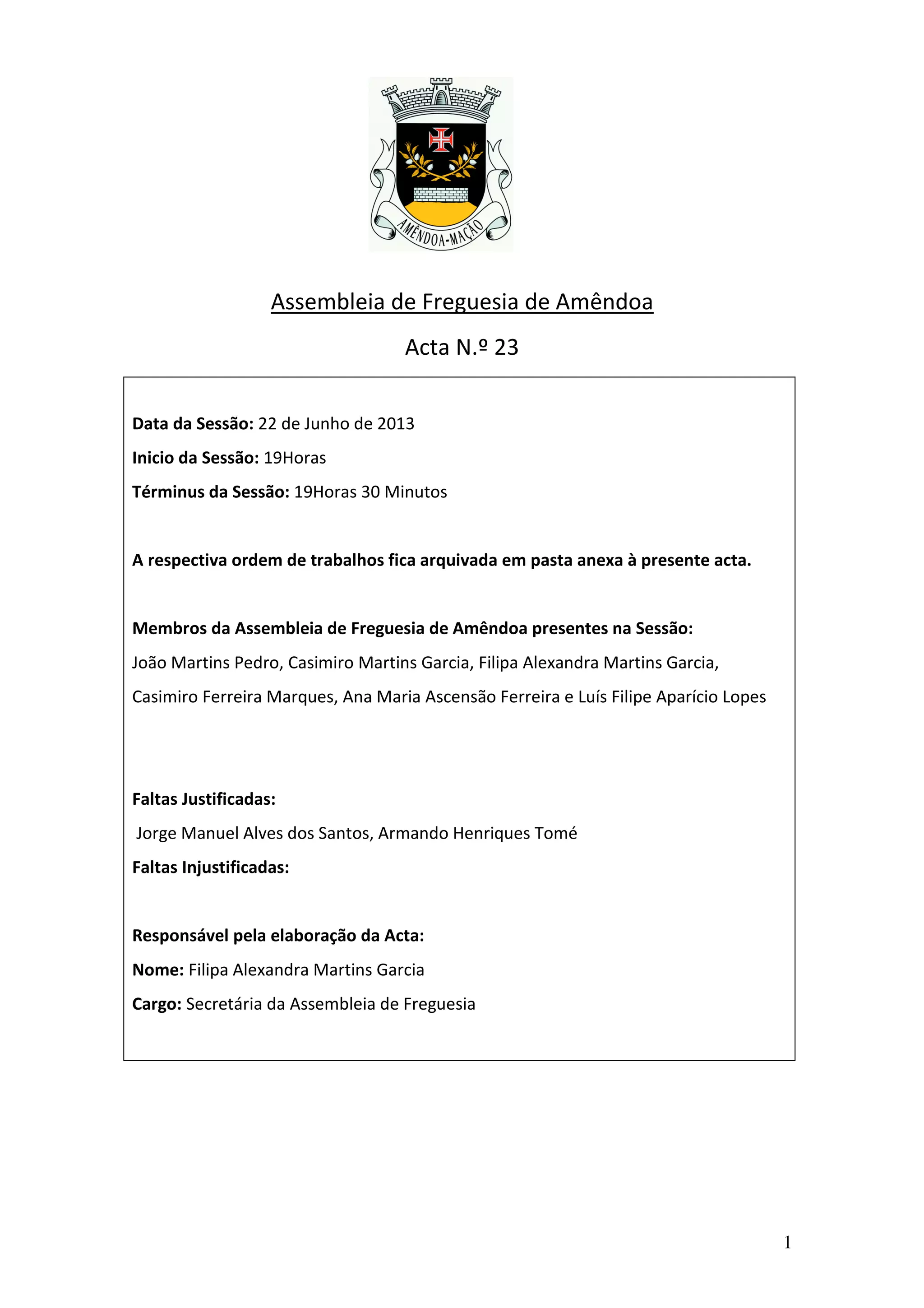 1) A ata resume a 23a reunião da Assembleia de Freguesia de Amêndoa realizada em 22 de junho de 2013.