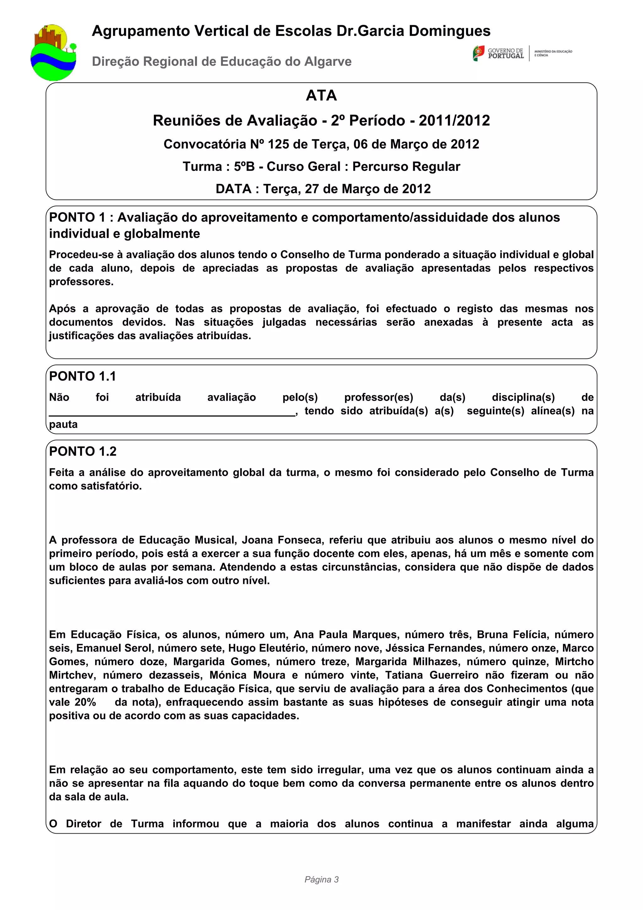 Este documento resume as atas de uma reunião de avaliação de turma do 2o período letivo de 2011/2012. Nele, discute-se a avaliação individual e global dos alunos, planos de recuperação, alunos em risco de retenção e medidas de apoio a alunos com necessidades educativas especiais.